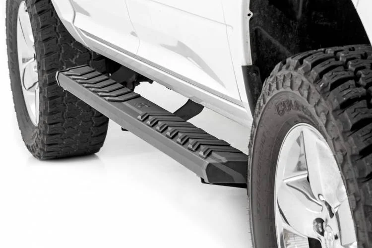 Durable Construction. Rough Country's BA2 Running Board Steps feature a comfortable, 5-inch wide stepping area with an integrated insert design that ensures foot placement when climbing in and out of your vehicle. Each running board features a durable powder-coated finish and a nonslip design that can support up to 500lbs!