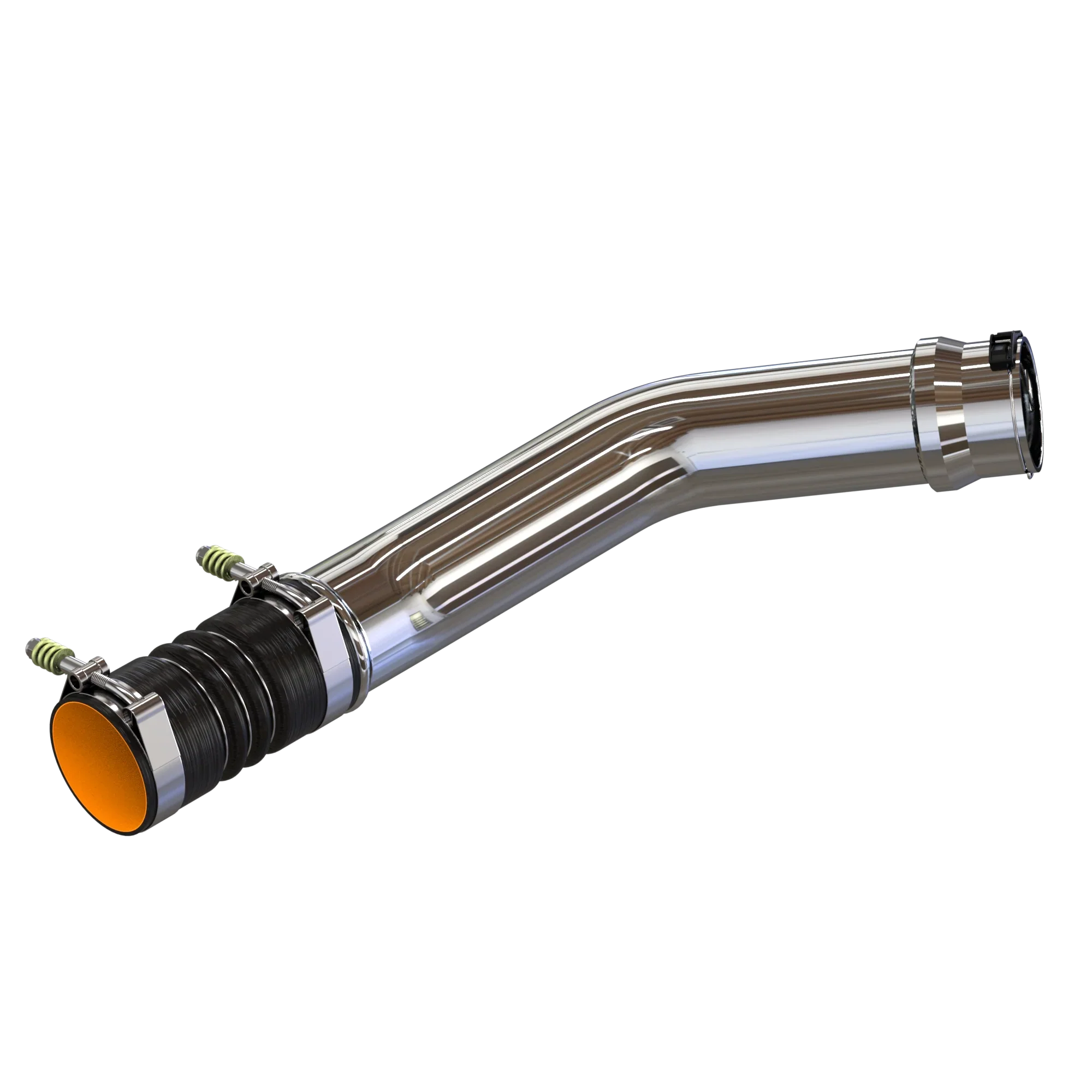 Our two piece hot side pipe and silicone hose design makes for a quick installation. We replace the upper coupler with a billet coupler that is tig welded to our pipe.