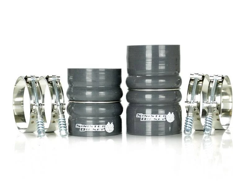 he Sinister Diesel Hot Side Charge Pipe for the Powerstroke 6.4L replaces the stock, restrictive piping that connects the turbocharger to your intercooler. This upgraded pipe is larger in diameter and has smooth mandrel bends to increase air flow velocity to improve power and lower EGTs. The Sinister Diesel Hot Side Charge Pipe is also more durable, being made from 6061 Aluminum alloy and connected with Sinister Diesel's 4-ply silicone boots that are rated up to 400psi. Our Intercooler Pipes are masterfully TIG welded and finished in polished and powdercoated Sinister Blue for a beautiful under-hood look.