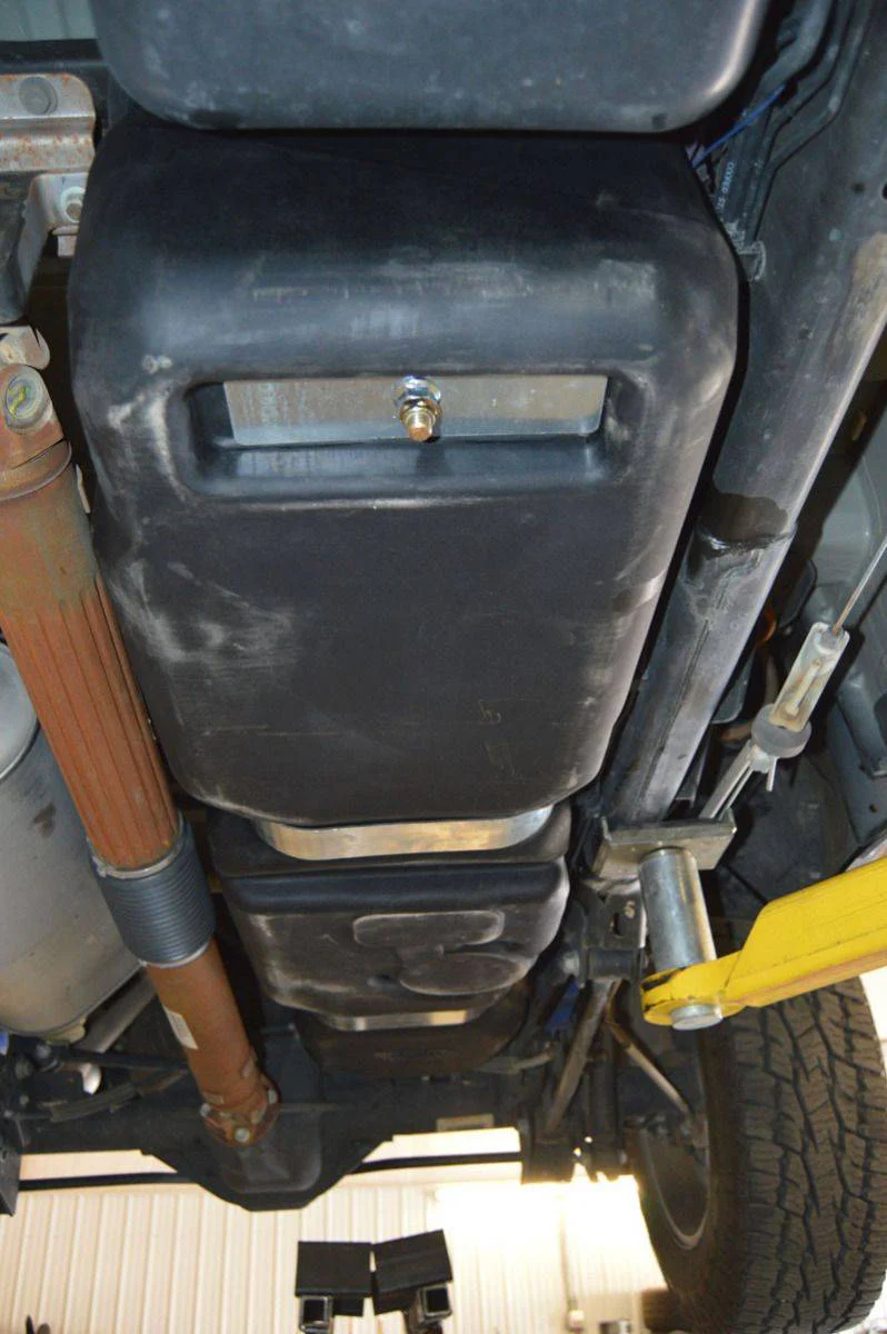 39 Gallon*, extra heavy duty cross-linked polyethylene fuel tank. Comes complete with powder-coated or plated steel mounting strap set, extruded rubber mounting bushings, vent hose, rollover safety vent valve, seals and required clamps. Tank hangs approximately only 1.5" below bottom of the stock fuel tank shield bracket (on vehicles so equipped). Tank is approximately 2.5” deeper than the stock OEM tank.